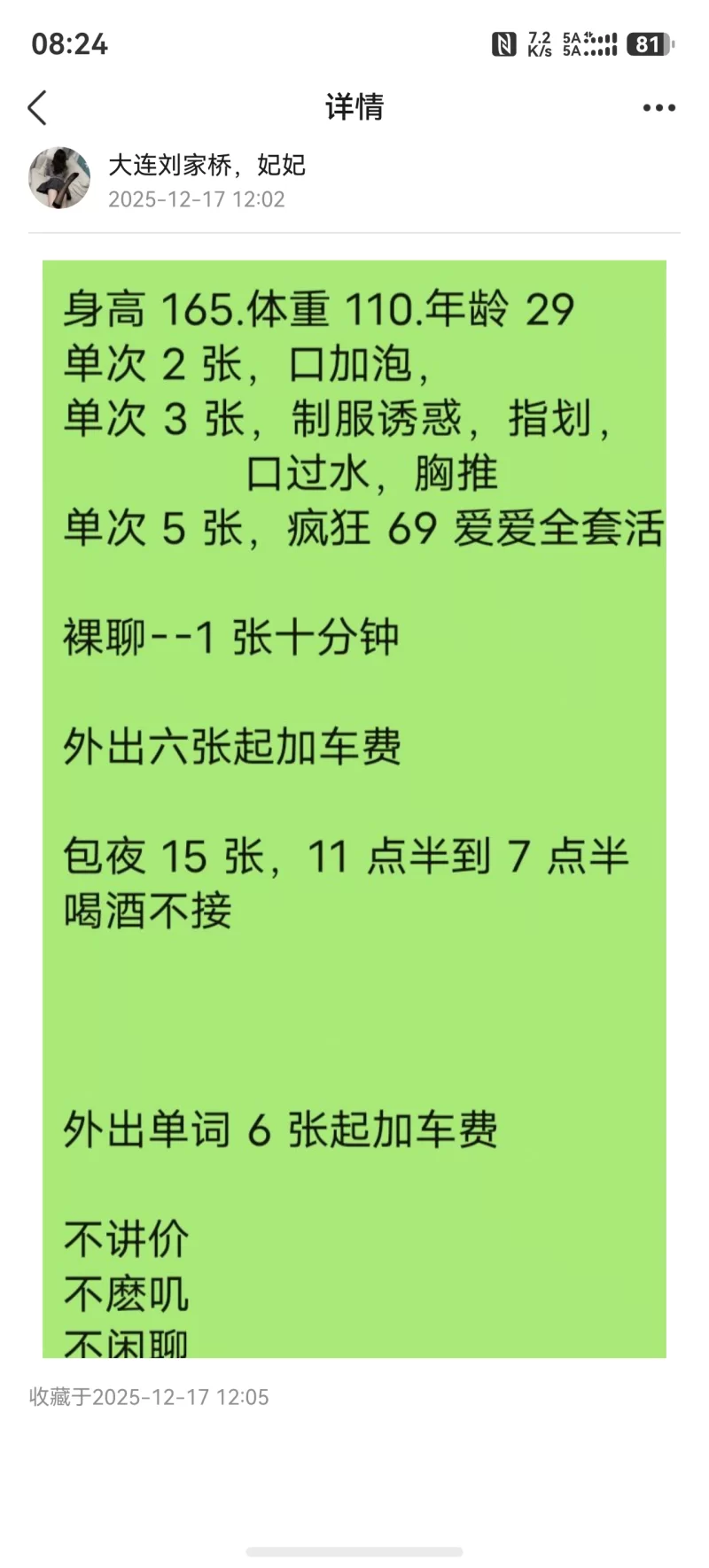 威客管理提示:要求付定金 保证金的,总之提前要钱的都是骗子 之前就联系妹子,不过妹子始终是关机状态,8号一早报着试试看的态度拨打了电话,没想到通了,离我单位很近,开车十分钟到位。到地方之后妹妹指挥上楼,环境吗太一般了,老旧小区,不能洗澡,没有暖气但是空调一直开着,床上有一个电褥子。很贴心的给你脱了衣服,穿着开裆丝袜,胸小了点儿,是我喜欢的那种口了一会儿翻身上马。感觉还是蛮真实的。过程中有人打电话来,也不催。个人觉得很好。